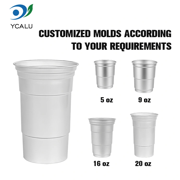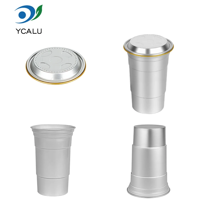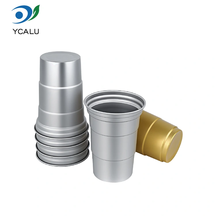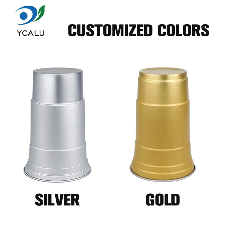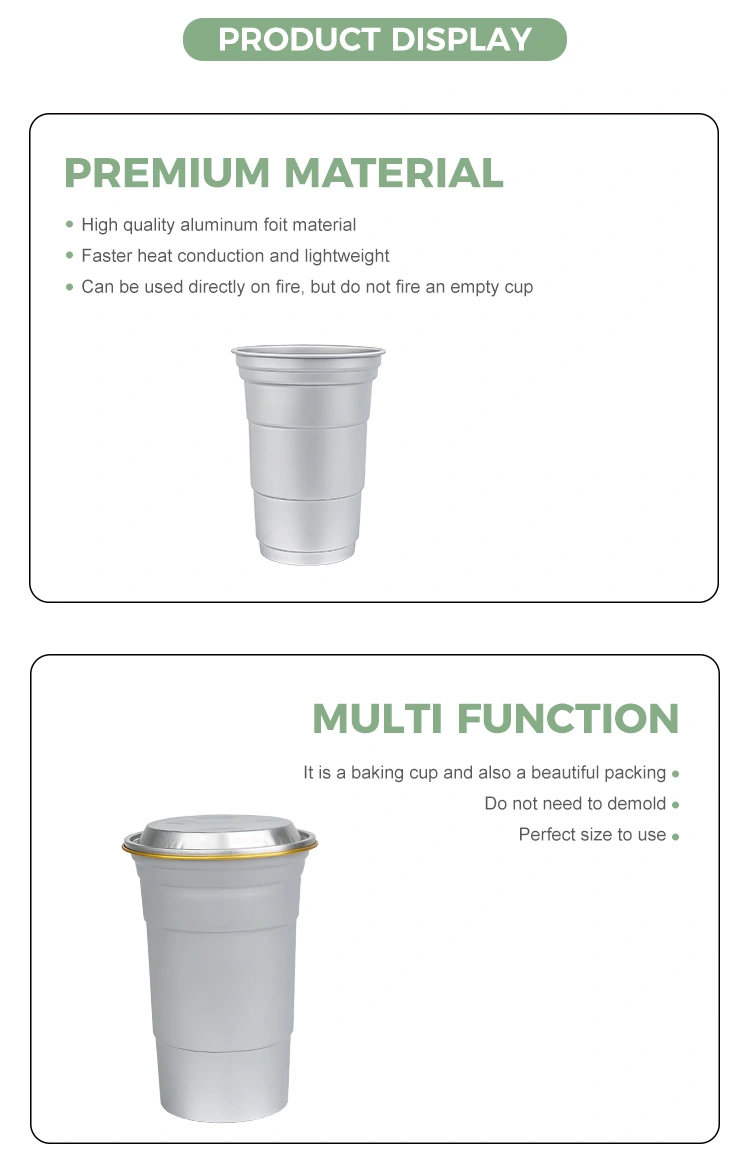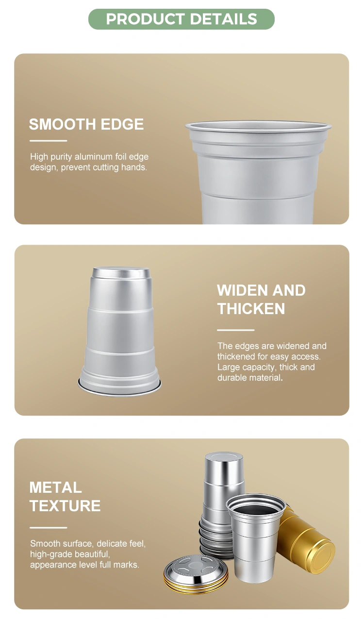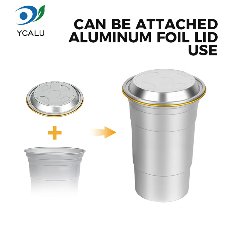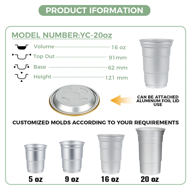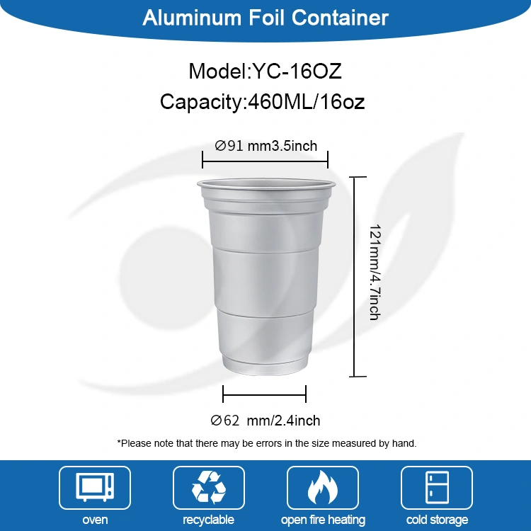 Yunchu е водещ китайски производител на чаши за напитки от 16oz за еднократна употреба от алуминиево фолио. Тази чаша за пиене от алуминиево фолио за еднократна употреба от 16 унции е чаша от алуминиево фолио от 460 милилитра, подходяща за стандартни напитки като кафе и бира. Той разполага със стандартизиран дизайн и е насочен главно към търговски потребители като кафенета и занаятчийски барове с чести нужди от персонализиране. Въпреки че осигурява ефективна топлопроводимост и основно запечатване, тази чаша за напитки от 16oz за еднократна употреба, рециклируема по поръчка от алуминиево фолио, също поставя по-голям акцент върху бързите и гъвкави услуги за визуално персонализиране на марката.
