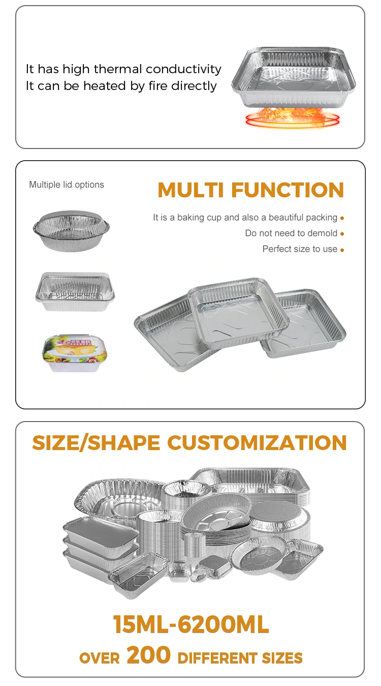 Доставчикът на алуминиеви фолио на Yunchu произвежда контейнери за сребърни алуминиеви фолио за барбекю за еднократна употреба, които са подходящи за поръчки за заемане на кетъринг, малки торти в пекарни, семейни закуски и ресторанти. Safe and healthy, food ideas are not limited, kitchen utensils are a good partner to easily cook food, air fryers and other equipment are heat-resistant and oil-proof, easy to bake, outdoor barbecue, temporary bowls are not afraid of fire, when using, food or soup needs to be placed, do not dry without water, household oven, clean and convenient, disposable plate, can be thrown away after use without cleaning, the container is integrated into the body, and Дизайнът на кант е обмислен, за да не се почеса с ръцете си. Предлагат се множество размери, за да избирате, за да отговаряте на различни сценарии за използване. Ако имате някакви въпроси или се нуждаете от повече информация, не се колебайте да се свържете с нас.