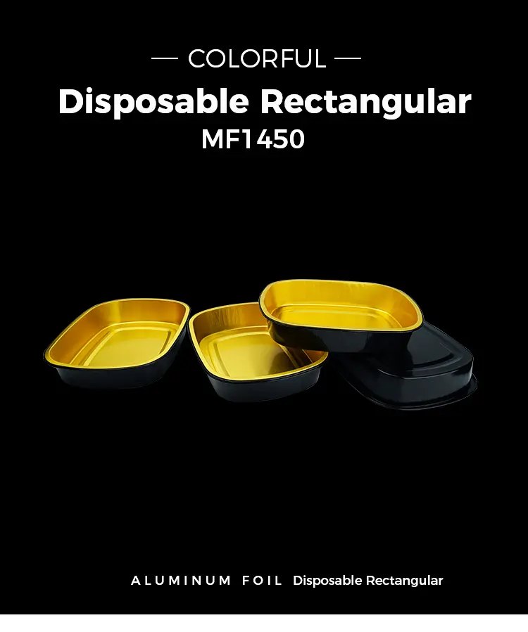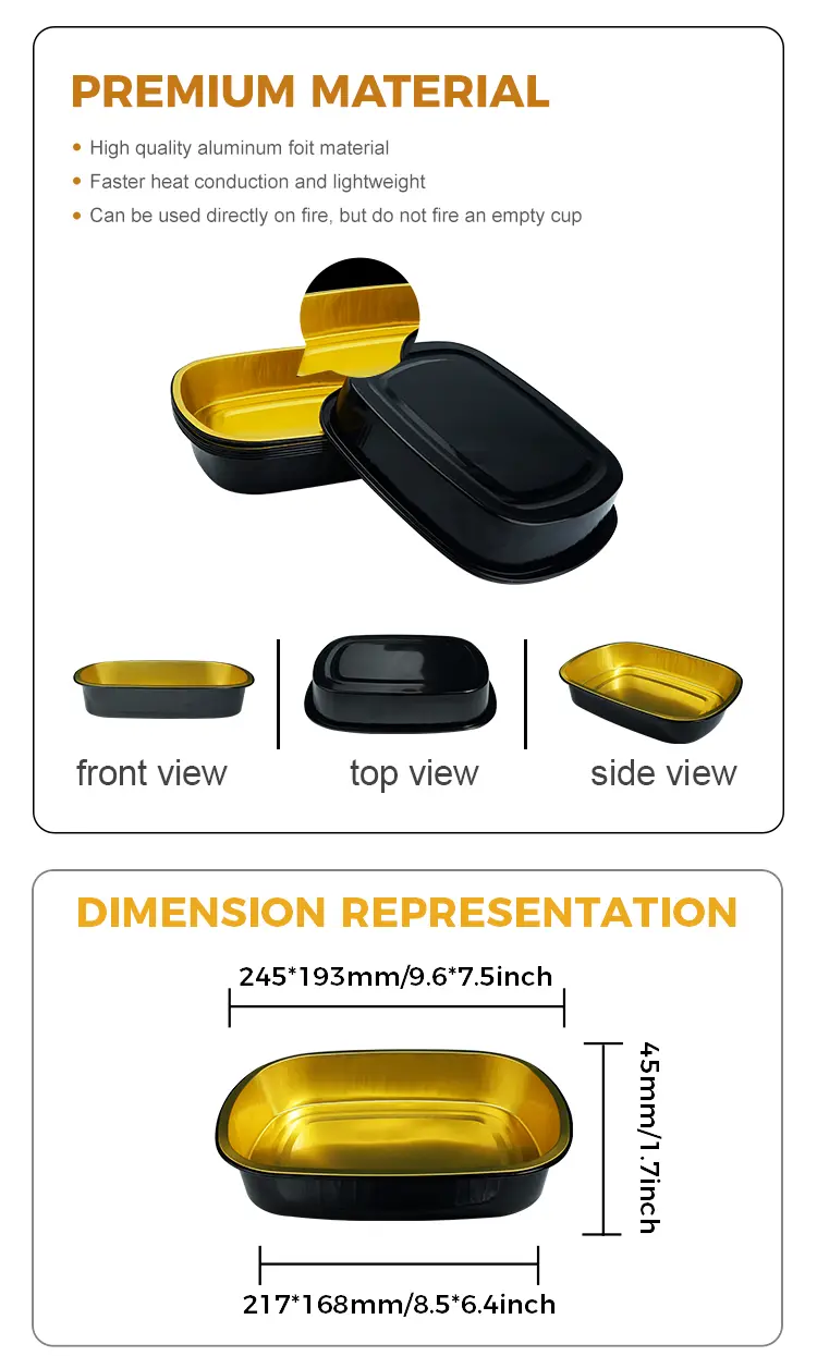 Правоъгълните контейнери за алуминиево фолио с черно злато за еднократна златица MF1450 имат горен диаметър 245*193 мм (9,6*7,5 инча), по -нисък диаметър 217*165 мм (8,5*6,4 инча), височина 45 мм (1,77 инча) и капацитет от около 1450 мл (51 -1 унции).