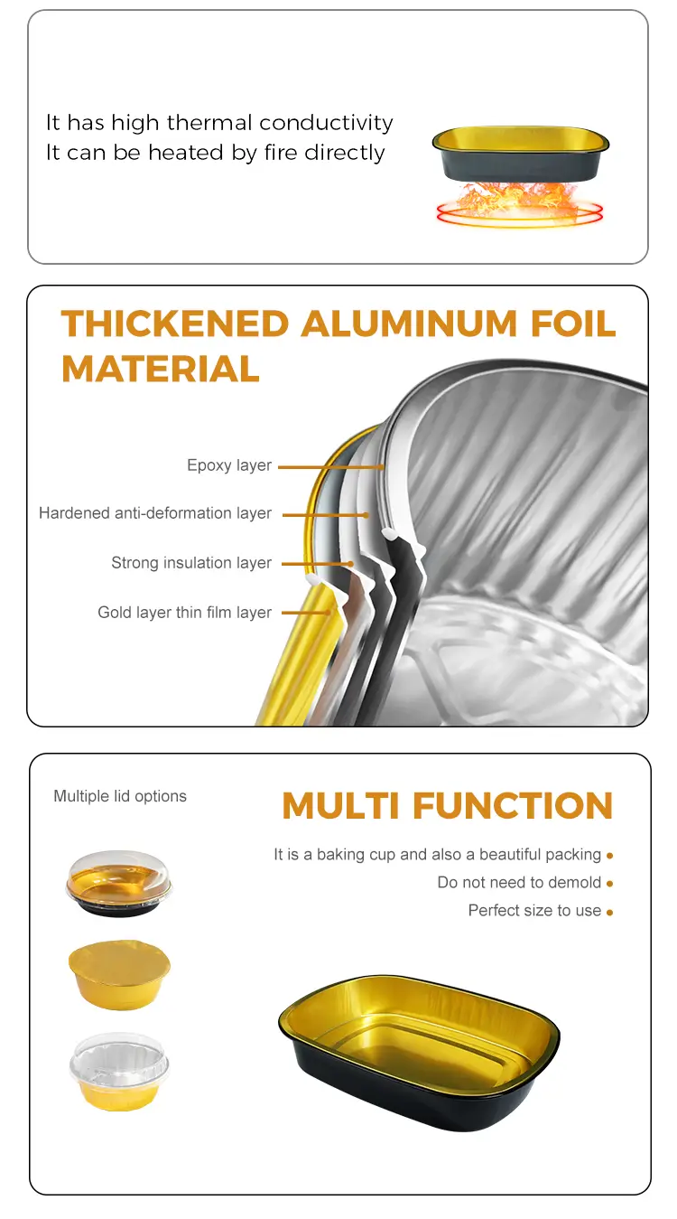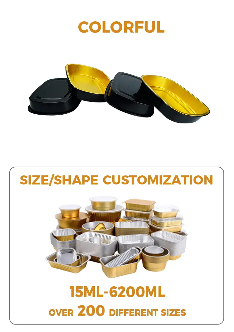 Yunchu aluminum foil supplier Disposable black gold baking tray Rectangular Aluminum Foil Containers MF1450 is suitable for large-scale catering, especially suitable for canteen catering, restaurant chain stores and refrigerated food distribution and other scenarios, this product is made of high-strength aluminum foil material, low height is suitable for some turkey, grilled fish, stewed and other ingredients of food to place, strong Термичната проводимост може равномерно да разпръсне високата температура, за да се гарантира, че храната се нагрява равномерно, с добър капацитет на носене на товари и компресивни характеристики, за да се гарантира, че не е лесно да се екструдира и деформира по време на транспортиране, може да се използва с топлинно уплътнение на фолио или пластмасов капак.