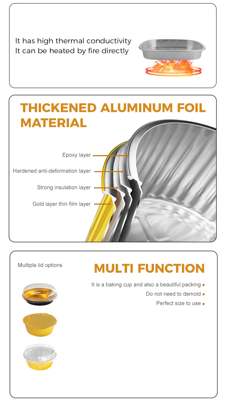 Това е идеалната опаковка за яйчени тарти, браунита, кексчета, единични парчета пица или люспести сладкиши. Изолационните свойства на алуминиевото фолио спомагат за запазване на топлината и меката текстура на сладкишите веднага след изпичането им; перфектно запазва вкуса и е подходящ за вкъщи от пекарни и кафенета.