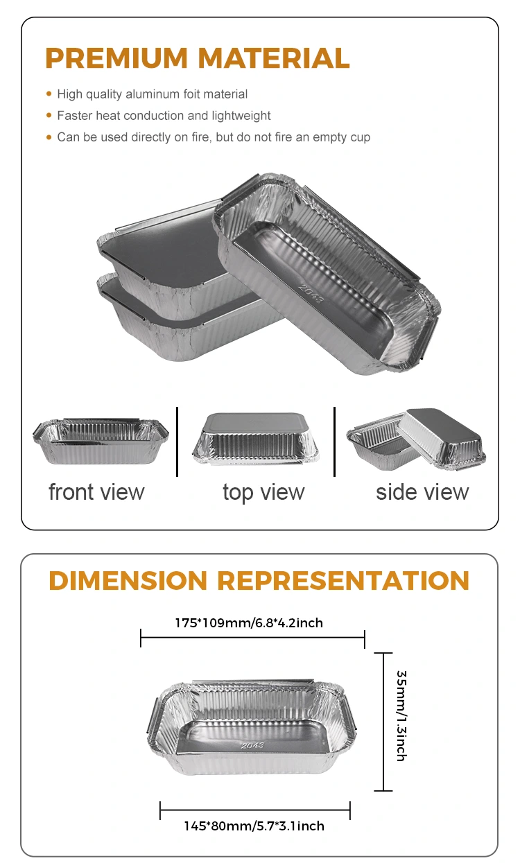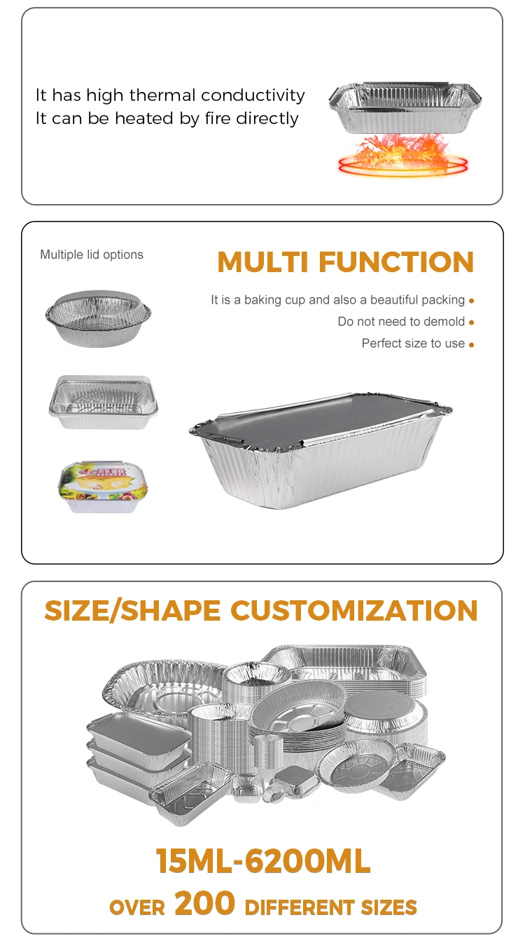 Тази кутия за бързо хранене за бързо хранене барбекю сребърни алуминиеви контейнери за фолио е изработена от висококачествен алуминиево фолио от 8011, който има добър ефект на запазване на топлина и може да поддържа температурата на храната, което прави храната по-вкусна и вкусна. В допълнение, нашият правоъгълна контейнер за алуминиево фолио за барбекю за барбекю също е оборудван с термична изолация, която може да бъде сдвоена с капак на алуминиево фолио или пластмасов капак на домашни любимци, което е удобно за персонализирано лого и допълнително подобрява изображението на марката.