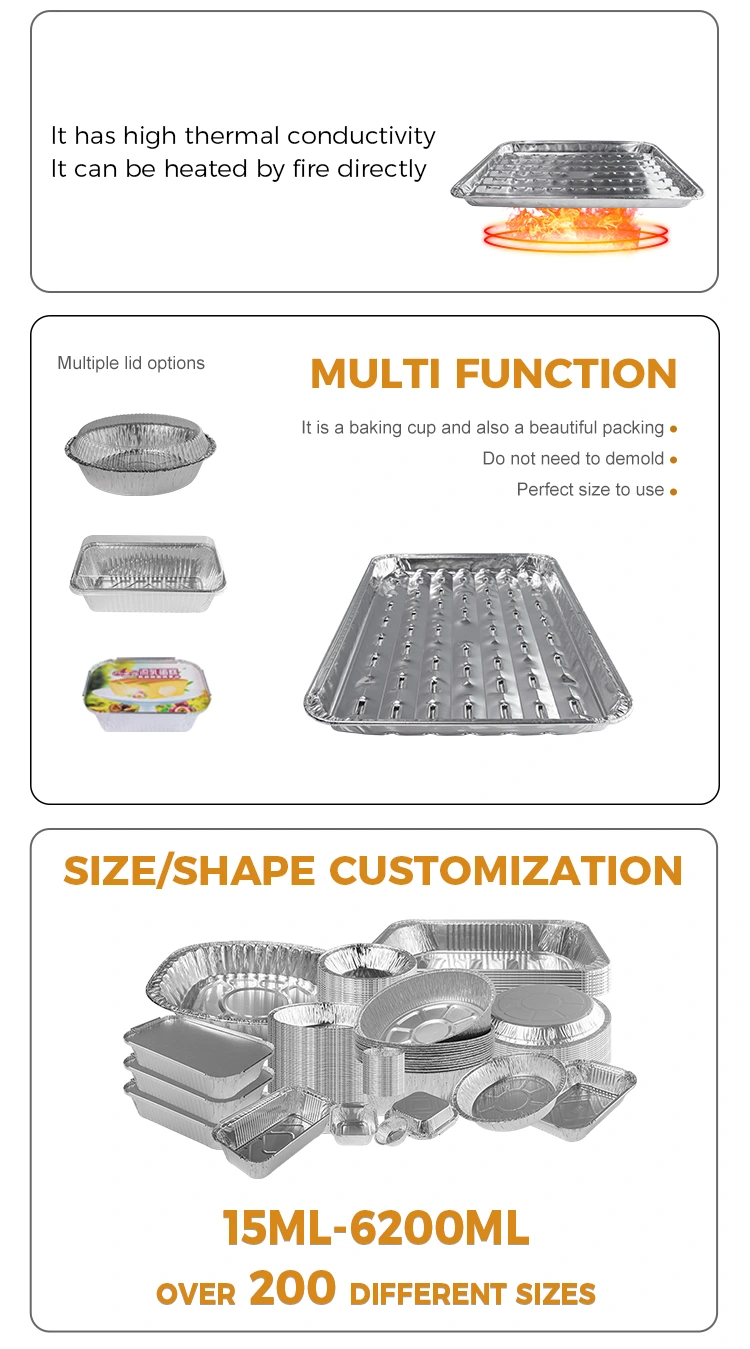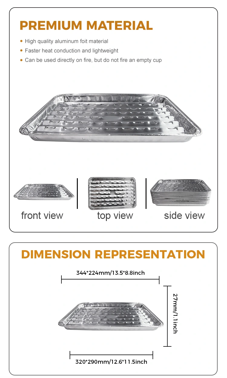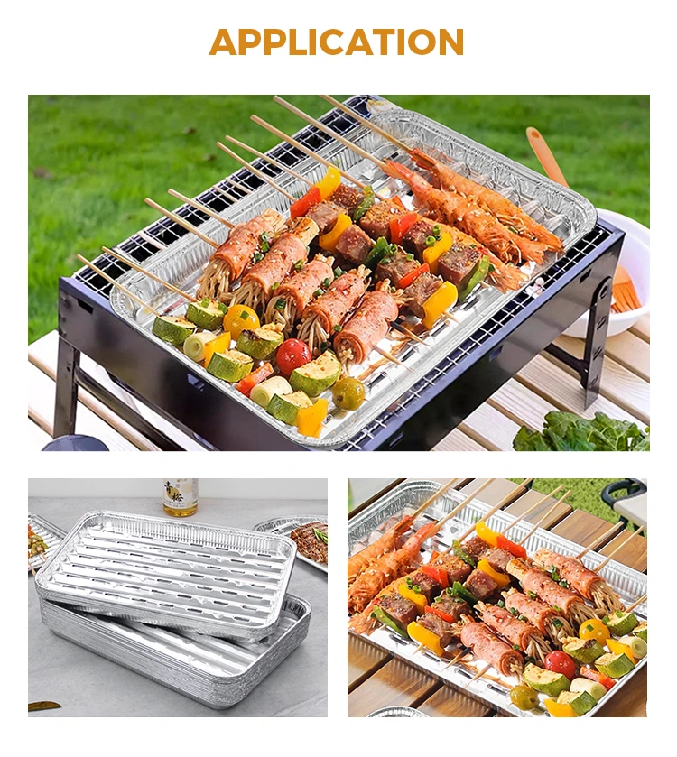 Yunchu Aluminium Foil Доставчик за еднократна употреба на грил е подходящ за скара на открито и на закрито, тази тава за печене има уникален дизайн на дупки, няма нужда да се притеснявате от проблема с нефтен дим. Дизайнът на дупките позволява бърза топлопроводимост и по -равномерно отопление, като се избягва местното прегряване на традиционните тави за печене. Независимо дали става въпрос за къмпинг в пустинята или семейно събиране, тази решетка осигурява чиста, здравословна среда за вашето барбекю. Алуминиево фолио на Yunchu Aluminium Foil Pan Tan е изработен от контактни материали за хранителни стоки, за да се гарантира хигиената и безопасността по време на процеса на барбекю. Висококачественият алуминиев материал за фолио е не само издръжлив, но и има гладка повърхност и няма миризма, което ви позволява да се наслаждавате на храненето си, без да се притеснявате за рискове за здравето. Този тиган за печене е проектиран с всеки детайл в ума, от външния вид до практичността.