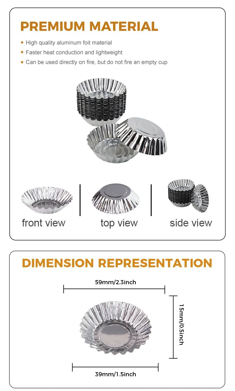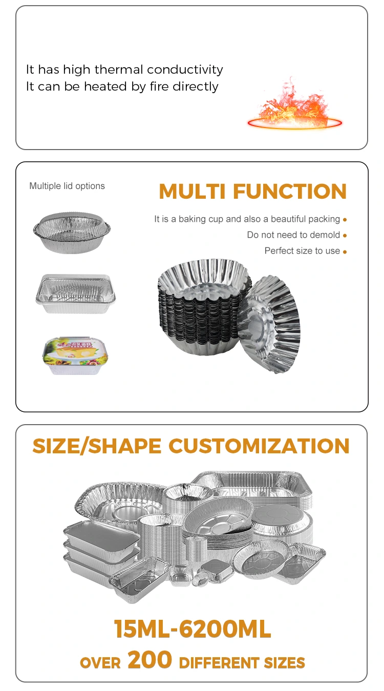 Неплъзгащото се алуминиево фолио контейнер чаша чаша чаша тяло е проектирано с текстура против приплъзване, увеличаване на триенето, предотвратяване на подхлъзване, дизайн на къдри чаша, лесно да се вземе, няма да навреди на ръцете, много голям дизайн на голям капацитет в едно време, без нужда от почистване, спестявайте време и енергия, широко използвани за печени яйцеклетки, пити, яйцеклетки, изминали немски ерпи, широко използвани за печени яйце Сертифициране на SGS и сертифициране на системата за управление на качеството на ISO9001, гарантиране на безопасността и екологичната благоприятност на продукта.