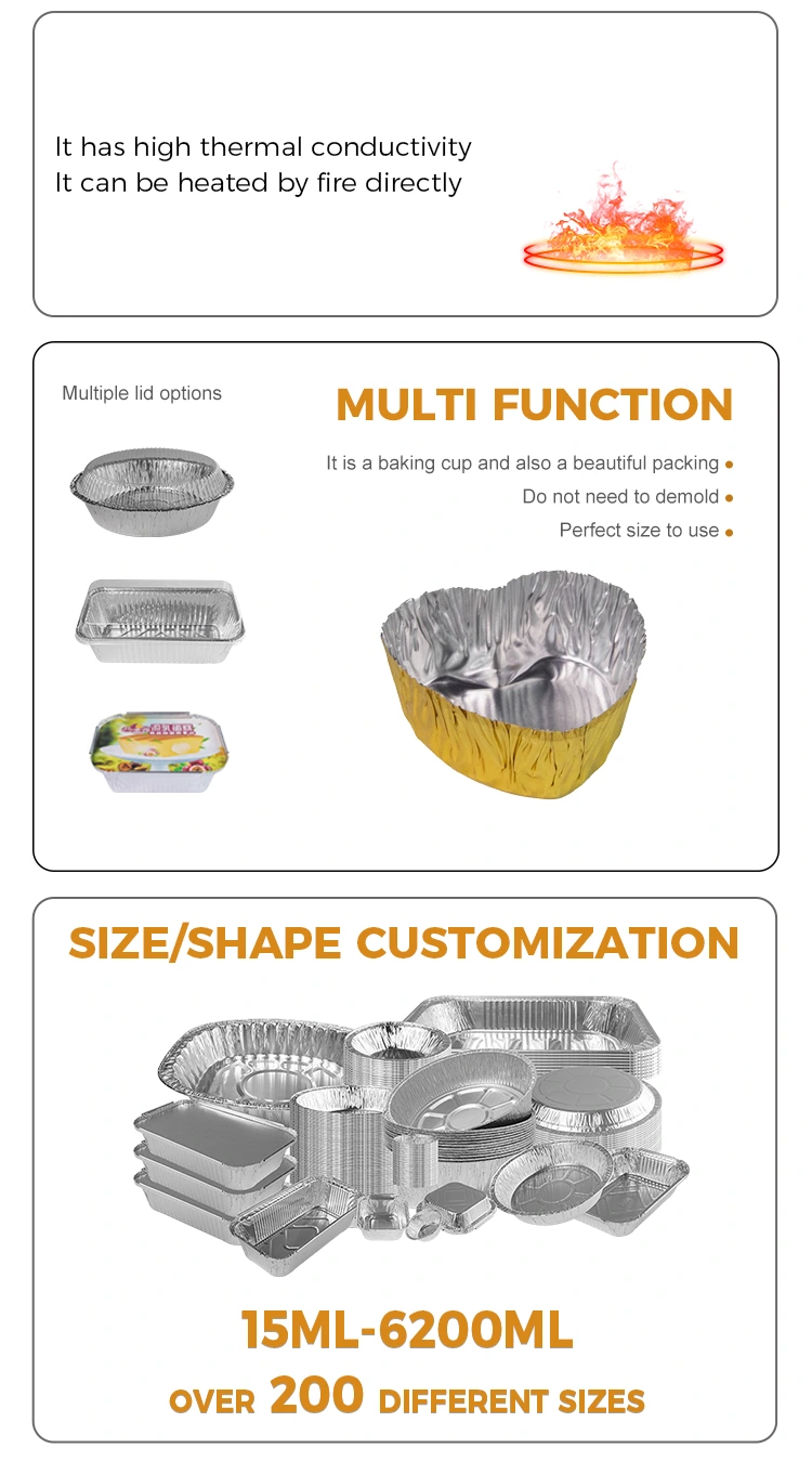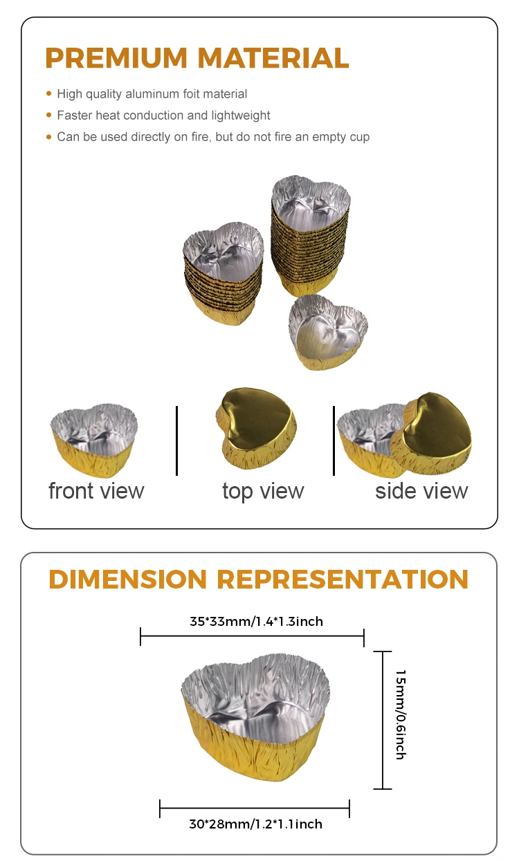 ​Yunchu aluminum foil supplier Heart-shaped mini-bake Silver Aluminum Foil Food Container is very suitable for small packaging, baking applications, unique design, heart-shaped design, can meet a variety of uses, one thing for multiple purposes, the use can place a variety of small food, in addition, the Heart-shaped mini-bake Silver Aluminum Foil Food Container surface is pleated design, which can prevent small snacks and chocolates and other Храни от подхлъзване и могат да подобрят устойчивостта на приплъзване, могат да бъдат персонализирани различни цветове.