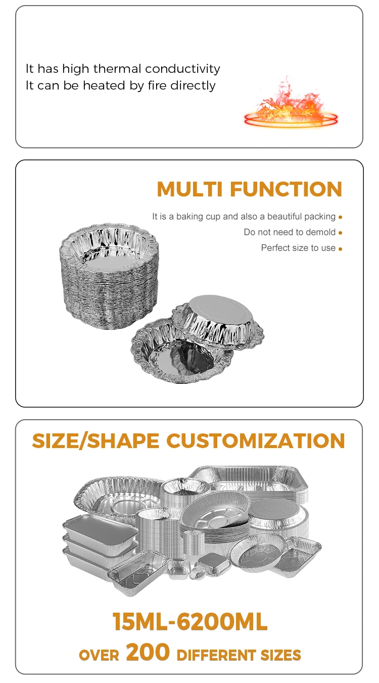 Алуминиевото фолио Yunchu ви осигурява дантелено кръгло торта за печене Сребърно алуминиеви контейнери за фолио е универсално за печене и пара. Той е предназначен за множество приложения, способен да прави торти, торти за купа и различни други деликатеси. Той е за еднократна употреба, няма нужда от почистване и може да издържа на високи температури от -30 ℃ до 250 ℃, а не да гори или да се счупи. Изработени от дебели, висококачествени, хранителни и екологични материали, по-безопасно е да се използва без вредни вещества. Той е устойчив на повреди, здрав и издръжлив, със силна якост на опън и добро удължаване, докато краищата са гладки, за да се избегнат разфасовки. Налични са различни спецификации за задоволяване на различни нужди за печене.