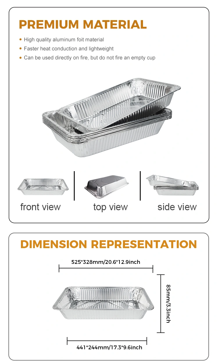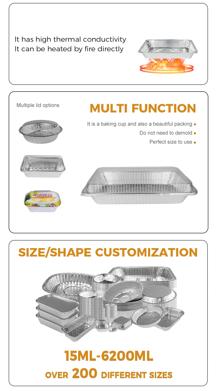 Характеристики: Този контейнер за сребърно фолио за печене на външен капацитет е изработен от алуминиево фолиово фолио с храна 8011-0, който напълно отговаря на стандарта за контакт с храни, осигурявайки безопасност на храната без особена миризма и по-сигурна за използване. Той има вътрешен и изпъкнал вътрешен дизайн, който е по -сигурен за използване. Оборудването е без почистване и защитава добре облицовката на оборудването. Независимо дали печене или отопление върху открит пламък, няма нужда да се притеснявате за деформация на контейнерите или да се отрази на безопасността на храните.
