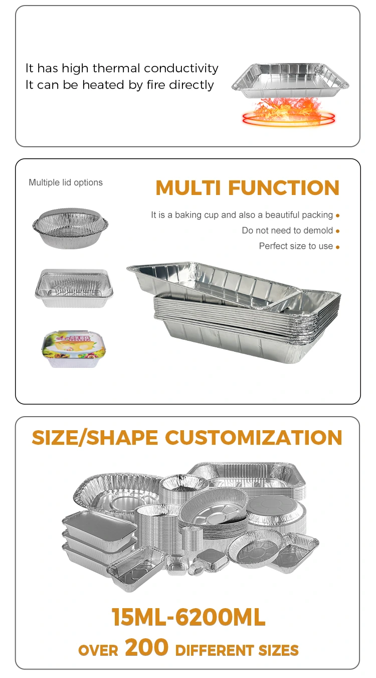 Доставчик на алуминиево фолио на Yunchu Голяма риба на скара, завземаща сребърна контейнери за алуминиево фолио, отговаря на различни нужди за готвене, подходящи за различни поводи като фритюрници на въздуха, барбекю скара, пещи на ротисерии и изработка на морски дарове. Този алуминиев контейнер за фолио е специално проектиран с повдигнат ръб, за да се предотврати ефективно разливната храна и залепването към стената на гърнето и защитава облицовката на тигана с множество слоеве, което е практично и безгрижно. Той е изработен от материал от 8011-0 с храни, с устойчива на топлина температура до 520 ° C, а не изгоряла или счупена, а удебеленият материал прави не лесно да се деформира. Кутията за алуминиево фолио се сгъстява като цяло, така че можете лесно да я вземете след готвене, без да се притеснявате за деформация по време на употреба. Дизайнът на Hemmed прави удобен за задържане, а краищата са закръглени, така че не е нужно да се притеснявате да надраскате пръстите си. Гладките ръбове се допълват от PET напълно прозрачни капаци и алуминиеви фолио за фолио, което ги прави по -подходящи за различни методи за готвене.