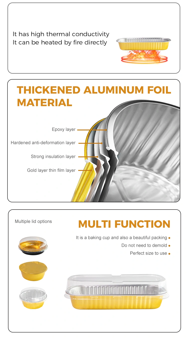 Yunchu алуминиево фолио доставчик на коша Екологичен, вдлъбнатият и изпъкнал дизайн в долната част не само увеличава стабилността на продукта, но и играе роля в анти-плъзгането; Укрепващите отстрани подобряват здравината на продукта, което го прави по-траен, а в допълнение този правоъгълна светлинна алуминиева контейнер с алуминиево фолио предлага разнообразие от цветове, от които да избирате, което ви позволява да го персонализирате според вашите предпочитания.