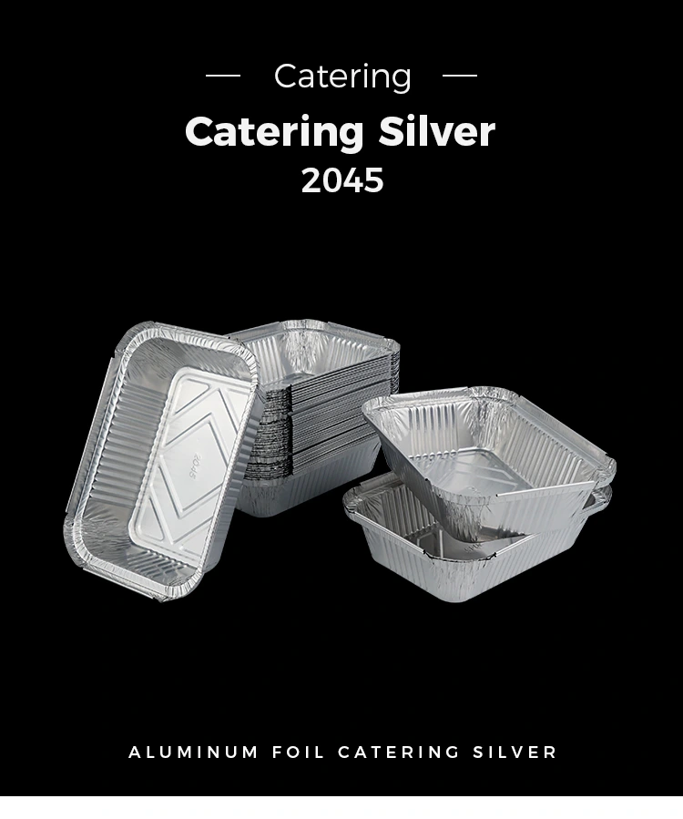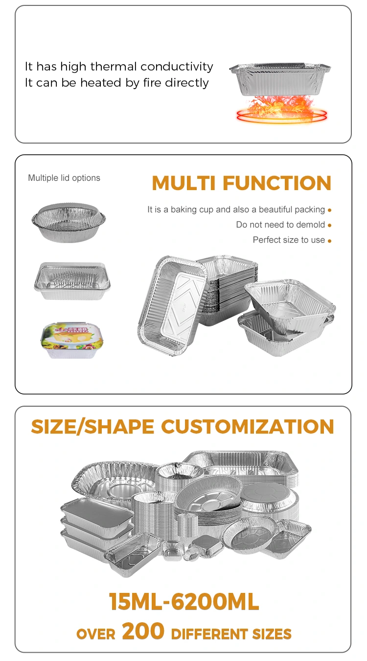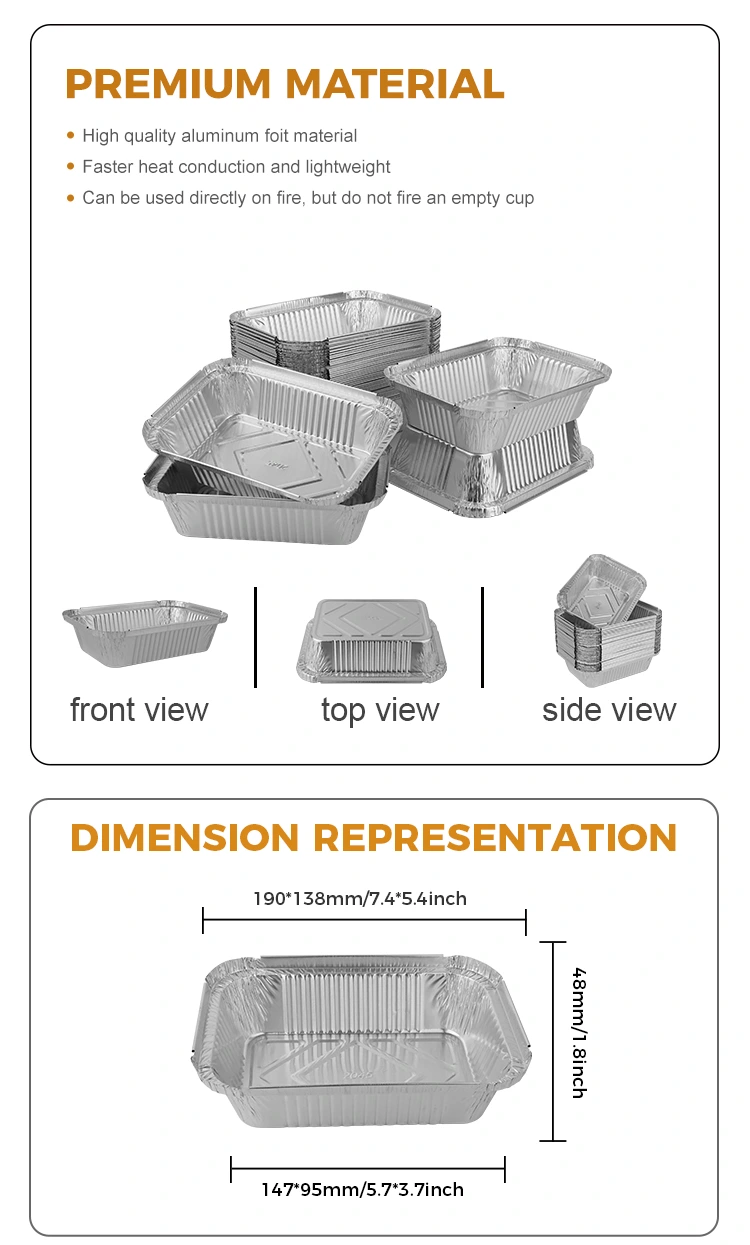 Кутиите за обяд от алуминиево фолио, които предоставяме, са изработени от материал от алуминиево фолио 8011, който има отлични топлоизолационни свойства и може ефективно да поддържа температурата на храната. По-специално, нашият правоъгълен сребърен контейнер от алуминиево фолио за печене на кутии за обяд не само има свойства за запазване на топлината, но може да се използва и с капак от алуминиево фолио, за да се улесни персонализираното персонализиране на ЛОГОТО.