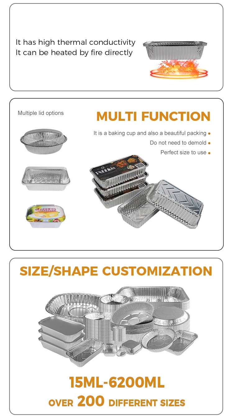 Алуминиев доставчик на алуминиеви фолио Yunchu, правоъгълни барбекю сгъстени сребърни контейнери за алуминиево фолио, е добър помощник за барбекю, гореща тенджера, печене, опаковане на извличане, може да се извършват разнообразни умения за готвене в кутия, различни размери са подходящи за различни саксии и оборудване и т.н. Приложения за оборудване, устойчивост на топлина и масло, лесно печене, барбекю на открито, временни купи не се страхуват от огън, когато се използват, трябва да поставят храна или супа, не изсушават без вода, домакинските фурни са чисти и удобни за изхвърляне на ястия.