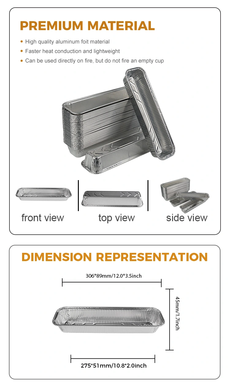 Тази правоъгълна контейнери за алуминиево фолио за алуминиево фолио за хляб се подлага на строго тестване на качеството, за да се гарантира, че не се пускат вредни вещества по време на отопление на отворен пламък, а потребителите не е необходимо да се притесняват от проблемите с безопасността. Освен това, неговият екологичен и траен дизайн не само осигурява безопасното транспортиране на продукти, но и поддържа най-добрия външен вид. Вдлъбнатата и изпъкнала дизайна в долната част повишава свойствата на плъзгане на продукта, докато добавените укрепващи отстрани увеличават твърдостта на продукта. Хемминг дизайнът е удебелен и задълбочен, с добра висока температурна устойчивост и топлинна проводимост, което може да постигне равномерно отопление и никаква особена миризма, което го прави много подходящ за използване при множество сценарии като скара на дървени въглища, дълъг хляб и доставка на извеждане.