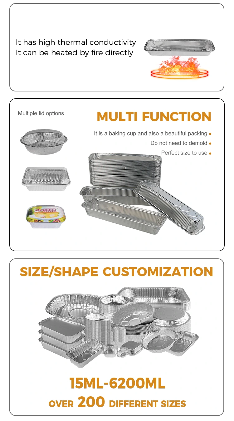 Характеристики: Правоъгълни контейнери за алуминиево фолио за алуминиево фолио за хляб Здравословни, екологични, хранителни материали, безопасни и нетоксични, възобновяеми и екологични материали, подчертавайки безопасността на храните и преследване на цялостното качество на продукта.
