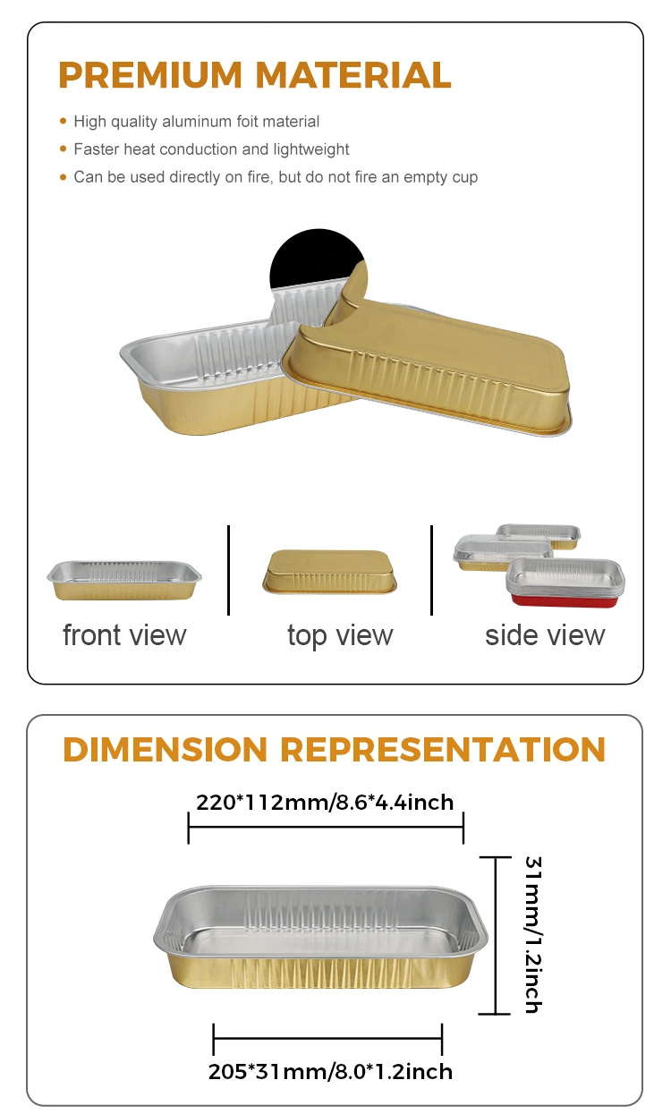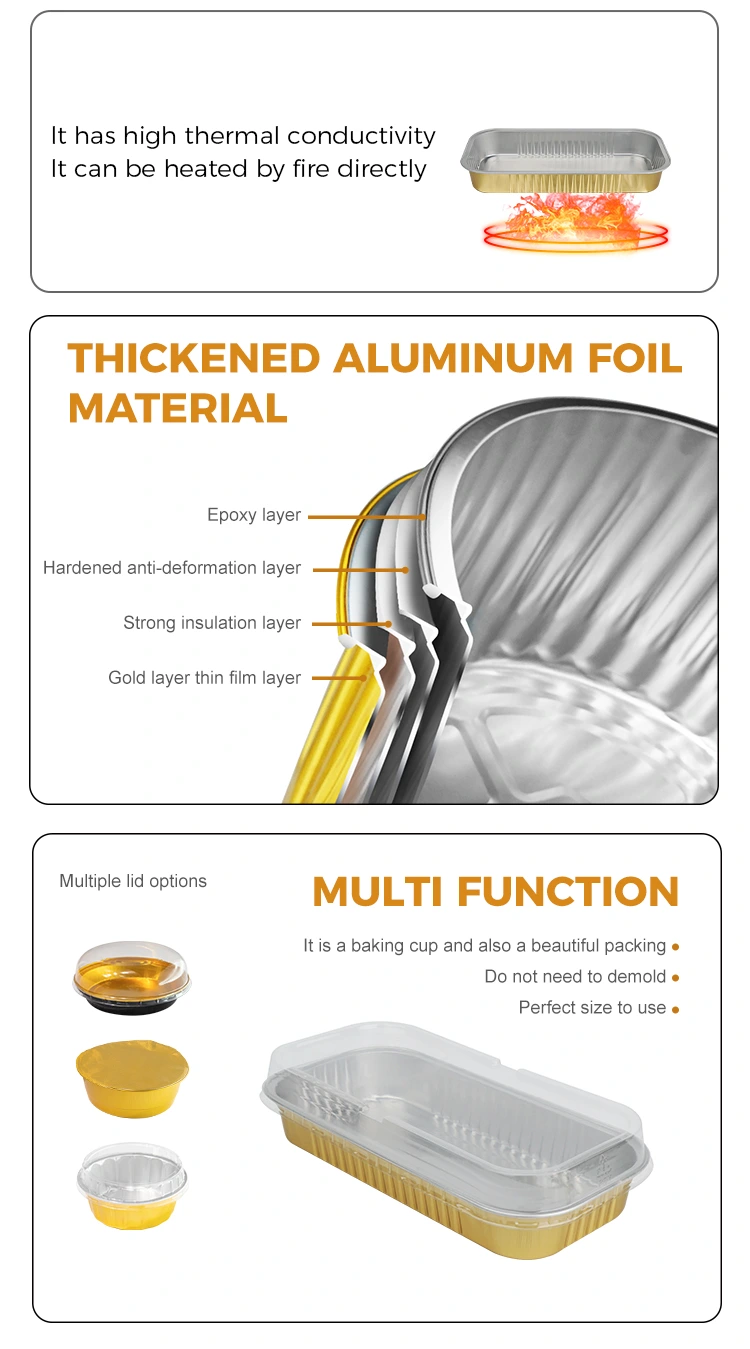 Отличната топлопроводимост на материала от алуминиево фолио позволява топлината на фурната да се пренася бързо и равномерно във вътрешността на храната, като се избягват локални проблеми с изгарянето или сандвичите. При печене на дълги сладкиши тялото на кутията приляга плътно към формата на храната, като задържа влагата и аромата. Изпечен отвън е хрупкав отвън, а отвътре е мек. Вкусът е много по-добър от обикновените стъклени или пластмасови съдове. Ръбовете на кутията са заоблени, което е устойчиво на надраскване и ефективно предпазва супата от изтичане. Правоъгълни златисти контейнери от алуминиево фолио за печене с гладка стена са подходящи за печени деликатеси със сосове (като лава шоколадови блокчета, рулца с карамелени ядки).