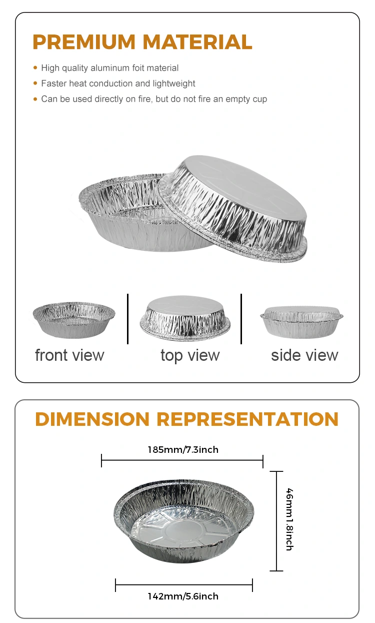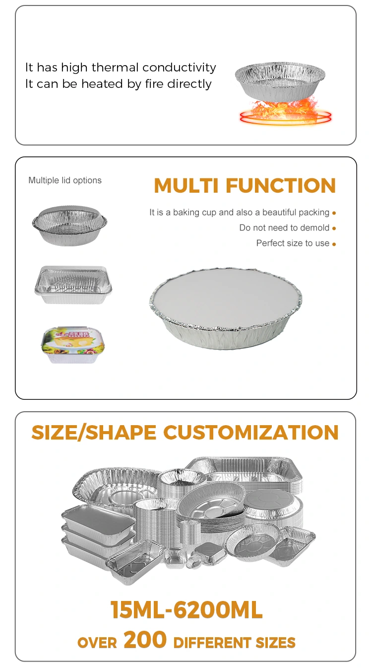 Характеристики: Едно цялостно формоване с уплътнени и печени устойчиви, възприемайки алуминиево фолио за контакт с храната, бъдете сигурни за контакт с храна, не е лесно да се деформират, а не изтичане, силна дебелина, устойчивост на корозия, устойчивост на висока температура.