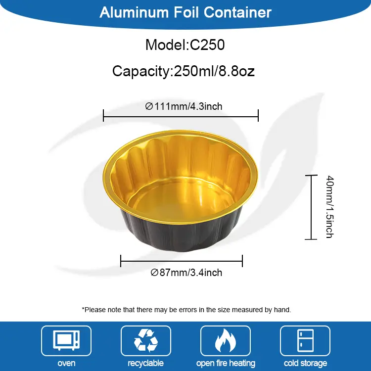 Кръгла купа за десерт за алуминиево фолио за десерт, горен диаметър 110 мм (4,3 инча), по-нисък диаметър 87 мм (3,4 инча), височина 40 мм (1,5 инча), капацитет от 250 мл (8,8 ов. Материалът за алуминиево фолио е изработен от алуминиево фолио от хранителен клас, за да се гарантира, че той може да се използва безопасно.