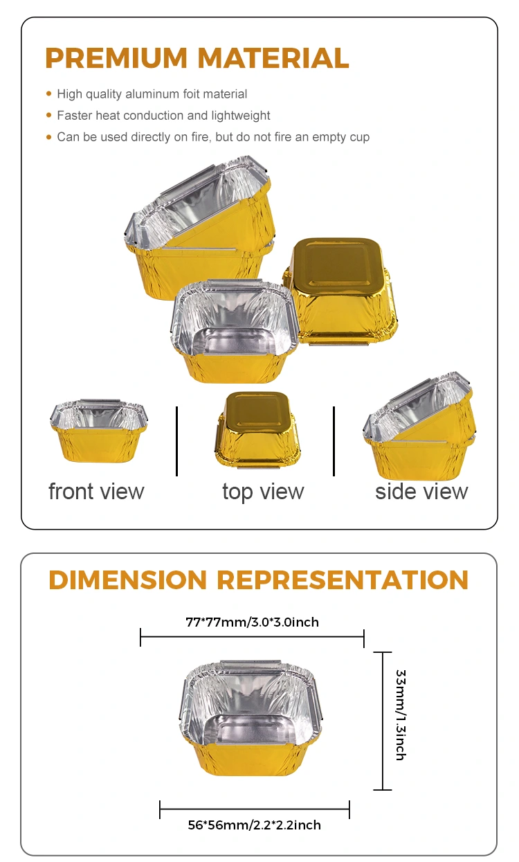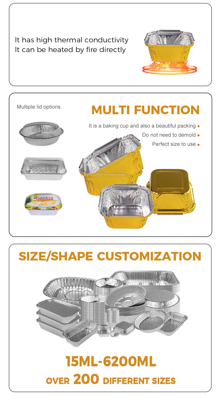 Сребърното фолио за печене на квадратна фурна, осигурен от доставчика на алуминиево фолио Yunchu, е кухненски алуминиев контейнер за фолио, който е подходящ за приготвяне на квадратни торти, бисквитки за печене, скара и готвене във фритюрник. Той не само има скромен капацитет (95ml), който лесно може да държи повечето храни, но и се предлага с напълно прозрачен капак на фолиото за домашни любимци, за да се запази ефективно прахът и други замърсители. Гладкият дизайн на повърхността прави контейнерите лесни за подреждане и съхранение, спестявайки ценно кухненско пространство.